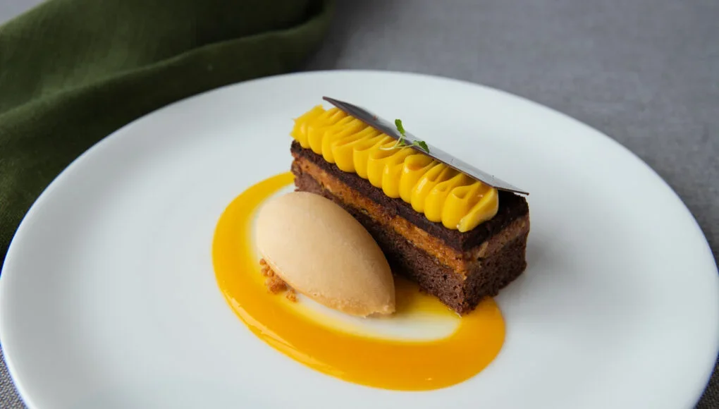The chocolate and passion fruit opera is a beautiful marriage of flavours and textures thanks to the luxurious Valrhona chocolate, sweet and tart passion fruit, crispy feuillantine, and creamy salted caramel ice cream.
