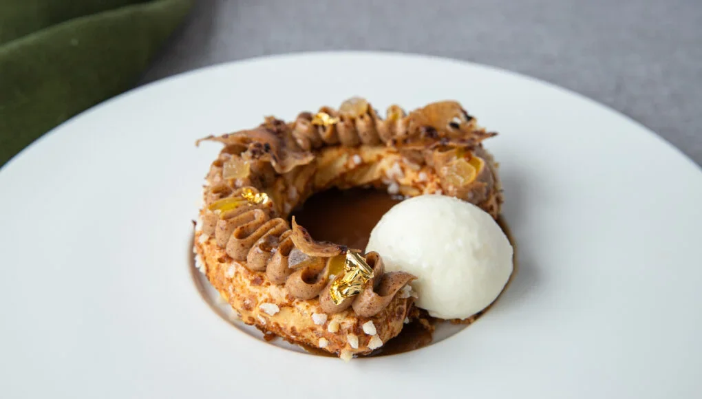 I love an alternative to a classic chocolate pudding and the Paris-Brest not only looks beautiful and ornate, it’s deliciously crisp and nutty with a coffee sauce that’s a perfect pick me up after dinner, cut through by a rich and tangy crème fraîche ice cream.