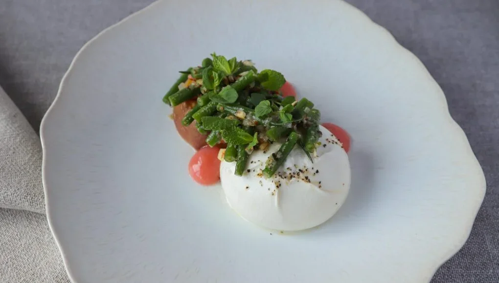 For a starter, I love the burrata because La Latteria is such a fantastic product. In the prime of summer when English white peaches are in season, they lend a complex fruitiness that combined with green beans, smoked almonds and the creamy burrata, makes this such a brilliant and unique dish that is a total crowd-pleaser.