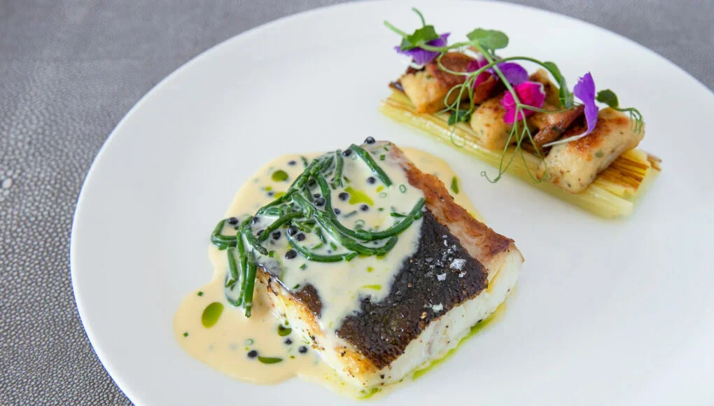Nothing reflects a shift to warmer weather like a beautiful and light fish dish. This halibut has won me over for its gorgeous spring colours and inviting contrast of flavours and textures. The halibut skin is pan-fried until crisp while the caviar-dotted smoked hay beurre blanc provides a richness that’s balanced by salty samphire and succulent white fish.