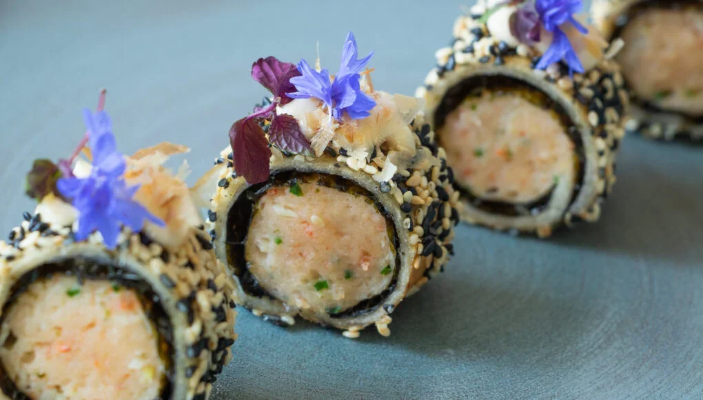 We always advise adding a hot canapé option to your menu, and our newest prawn and lobster toast is a distinctive option that will wow your guests. Sweet and delicate Cornish prawns and lobster are paired with pickled ginger bonito and finished with sesame seeds and purple basil. It’s crunchy, savoury, and light; ideal for summer evenings with a glass of champagne in hand.