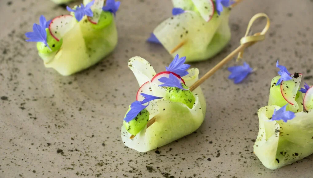 The perfect option for when the weather turns hot (Mother Nature permitting). Our new kohlrabi canape is a light and refreshing bite that also happens to be vegan. Pickled kohlrabi is paired with elderflower, water chestnut and edamame to create a delicate canapé with hues of green and blue that looks and tastes like a refreshing dip on a hot summer’s day.