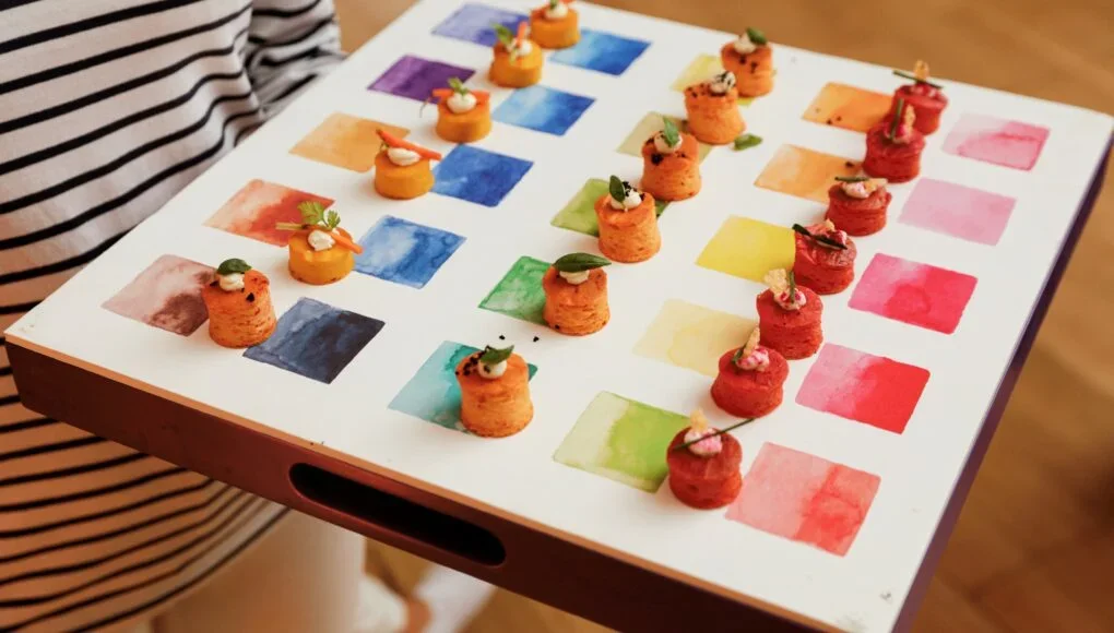 Nothing says summer quite like a flourish of colour, which is epitomised by our ombre soufflé canapés. With varieties including beetroot and goat’s curd, tomato and black olive, carrot purée with star anise, and sweetcorn with a parmesan crisp, these vibrant canapés not only look amazing, but they spotlight all the incredible British ingredients available at the peak of summer, from Isle of Wight tomatoes to sweetcorn from Devon. This crowd-pleasing display makes a striking addition to your canapé selection and encapsulates the colours and bounty of summer.