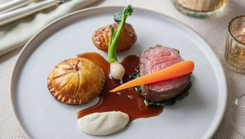 Reimagined from a traditional Steak & Guinness pie, our Raynham Estate Sirloin of Beef is a worthy hero for the season. Composed of tender braised beef cheek, an inviting Guinness and onion pithivier, roasted-’til-golden hasselback potato and a velvety turnip purée, it’s a wonderfully indulgent choice for any celebration.
