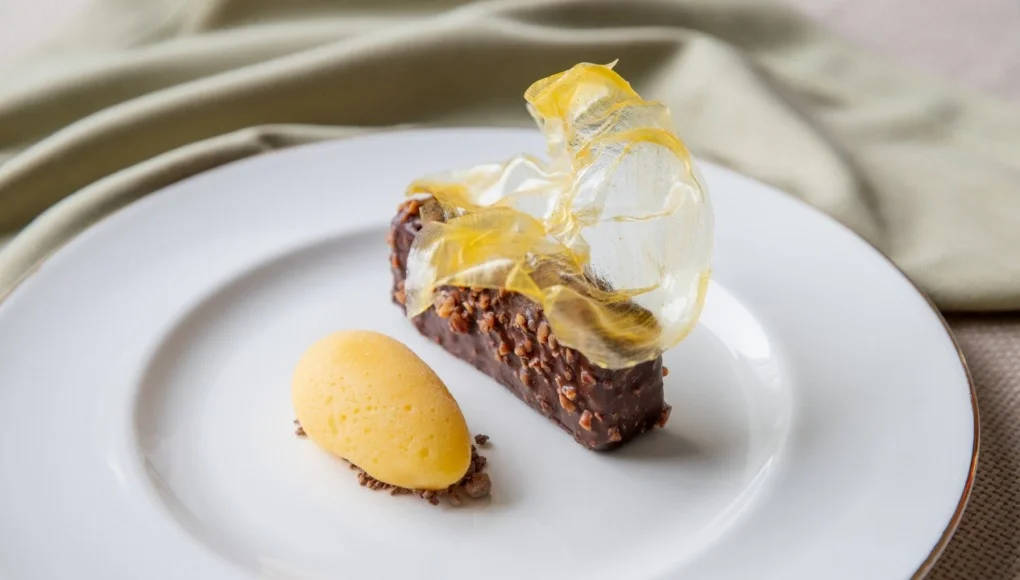 Pairing the rich warmth of hazelnut with the fresh tartness of seasonal mandarin, our chocolate and hazelnut dessert is an exquisite note to end an evening on. With layers of chocolate sponge, mandarin cream and gianduja ganache encrusted with hazelnut and beautifully topped with a cascading mandarin tuile, it makes an indisputable showstopper no matter the occasion.
