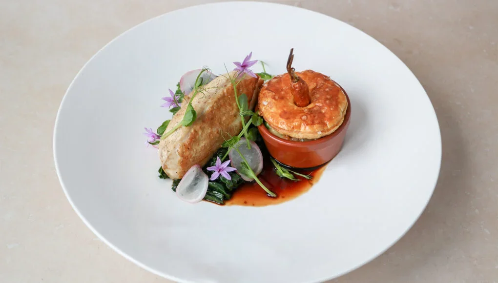 We turn our attention to the endlessly versatile corn-fed Cotswold White Chicken in this zero-waste main course. The chicken breast takes centrestage, pan-roasted to achieve the perfect crisp exterior, while an accompanying pot pie features a luscious interplay of buttery pastry and rich chicken stock. Tender chicken thigh and white turnips share the limelight, joined by the delightful addition of sweetheart cabbage, all harmonised by an indulgent tarragon jus.