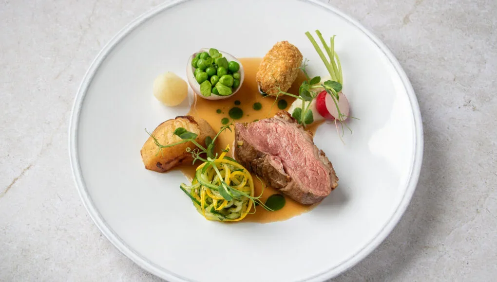 This main dish is a tribute to the season, showcasing the Herdwick Rump of Lamb, a distinctive breed of domestic sheep indigenous to the Lake District in North West England. The roasted lamb rump sourced from HG Walter takes centre stage, complemented by a delectable pairing of crispy potato pavé and a sumptuous lamb shoulder croquette. These components are thoughtfully counterbalanced with lighter elements, including a delicate pink Roscoff onion purée, fresh garden peas, and roasted white turnip.