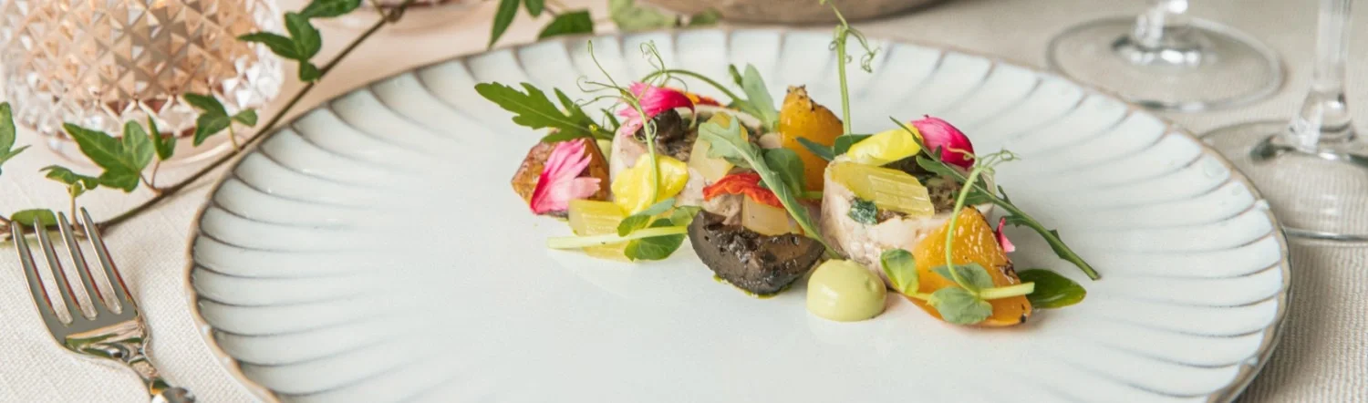 The Ballotine of Chicken is a light and refreshing chicken salad starter, teeming with the abundance of summer produce. The ballotine is complemented with Jersey Royal potatoes, wild garlic, and summer mushrooms. Accompanied by a lovage emulsion, pickled walnuts, and a fresh peach compressed in chardonnay vinegar, the ensemble is garnished with peppery rocket and nasturtium leaves.