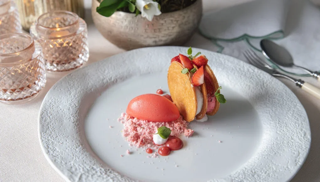 Finally, the Strawberry Arlettes is an exquisite interplay of fresh strawberries, intricately crafted puff pastry arlettes, and a decadent coconut & lime cream. Finished with a palate-refreshing strawberry sorbet, this dessert is the epitome of summer indulgence featuring plump British strawberries at the peak of their seasonality.